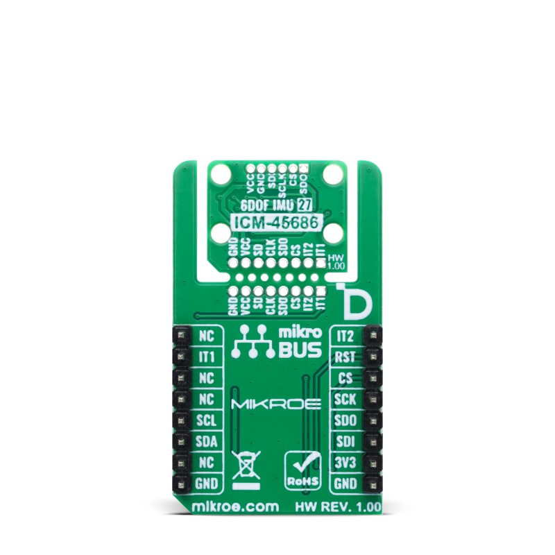 6DOF IMU 27 Click is based on the ICM-45686, a MEMS MotionTracking device from TDK InvenSense that integrates a 3-axis gyroscope and a 3-axis accelerometer in a single package. This high-performance motion tracking add-on board designed to provide accurate and reliable 6-axis motion sensing for a wide range of modern applications. The sensor is made with a dual interface architecture, combining both UI and AUX communication paths, allowing for exceptional flexibility in data acquisition. The ICM-45686 supports multiple host interfaces, including I3C, I2C, and SPI, ensuring compatibility with a variety of host MCUs. Thanks to its compact form factor and advanced features, 6DOF IMU 27 Click is an ideal solution for use in head-mounted displays, augmented and virtual reality (AR/VR) controllers, wearable technology, and various IoT-based systems that demand accurate motion tracking and robust sensor performance.
