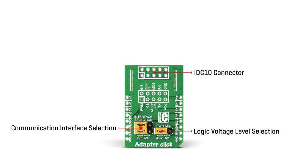 Adapter Click is an adapter board that simplifies the connection of add-ons with IDC10 headers to the mikroBUS™ socket. One 2x5-position 2.54mm pitch header makes an easy and elegant way to add the external connections to your development system, thorugh a mikroBUS™ socket. Each mikroBUS™ line is covered, except AN and RST, with two jumpers for communication selection and one for selection of power supply range.