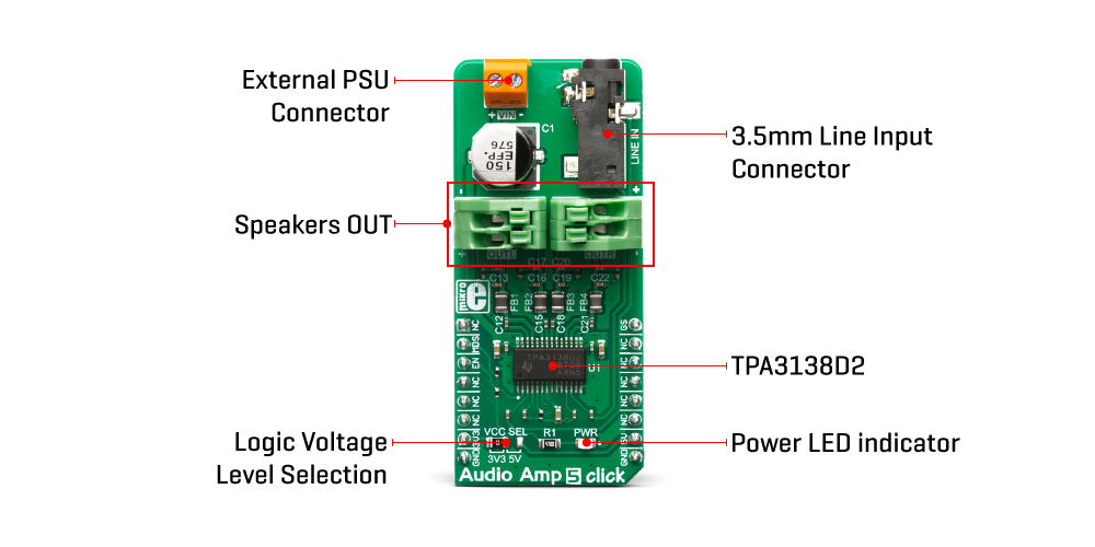 Although the TPA3138D2 IC requires an external PSU, it still uses power from the mikroBUS™ for the logic levels of its control pins. There is a logic voltage level selection SMD jumper labeled as VCC SEL, which allows interfacing with both 3.3V and 5V-tolerant pins of the host MCU.