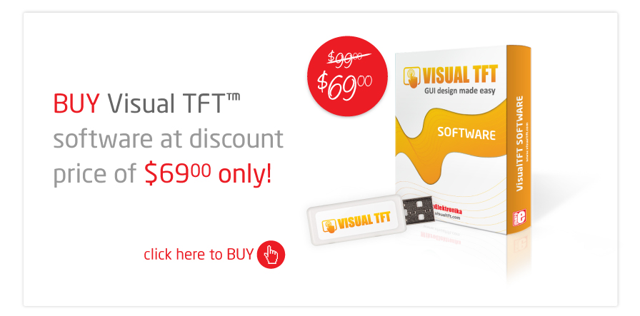You can purchase this amazing new software for Rapid Development of TFT GUIs for promotional price of just $69 USD for just a few more days. Visit the Visual TFT website and download fully functional demo and try it out today!