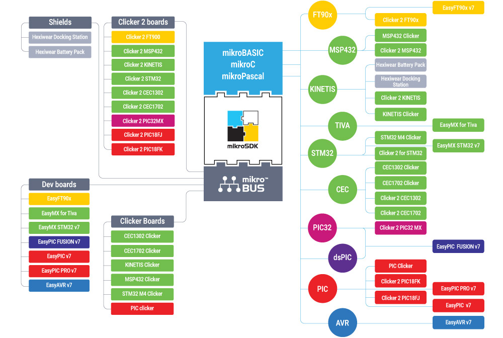 The mikroBUS API is currently developed for every clicker, clicker 2 and the main development boards with their default MCUs. Along with the support for these development systems, mikroBUS API contains the generic board def files for the main development boards, which can be used for adding support for any of the currently unsupported MCUs. More information about the generic board