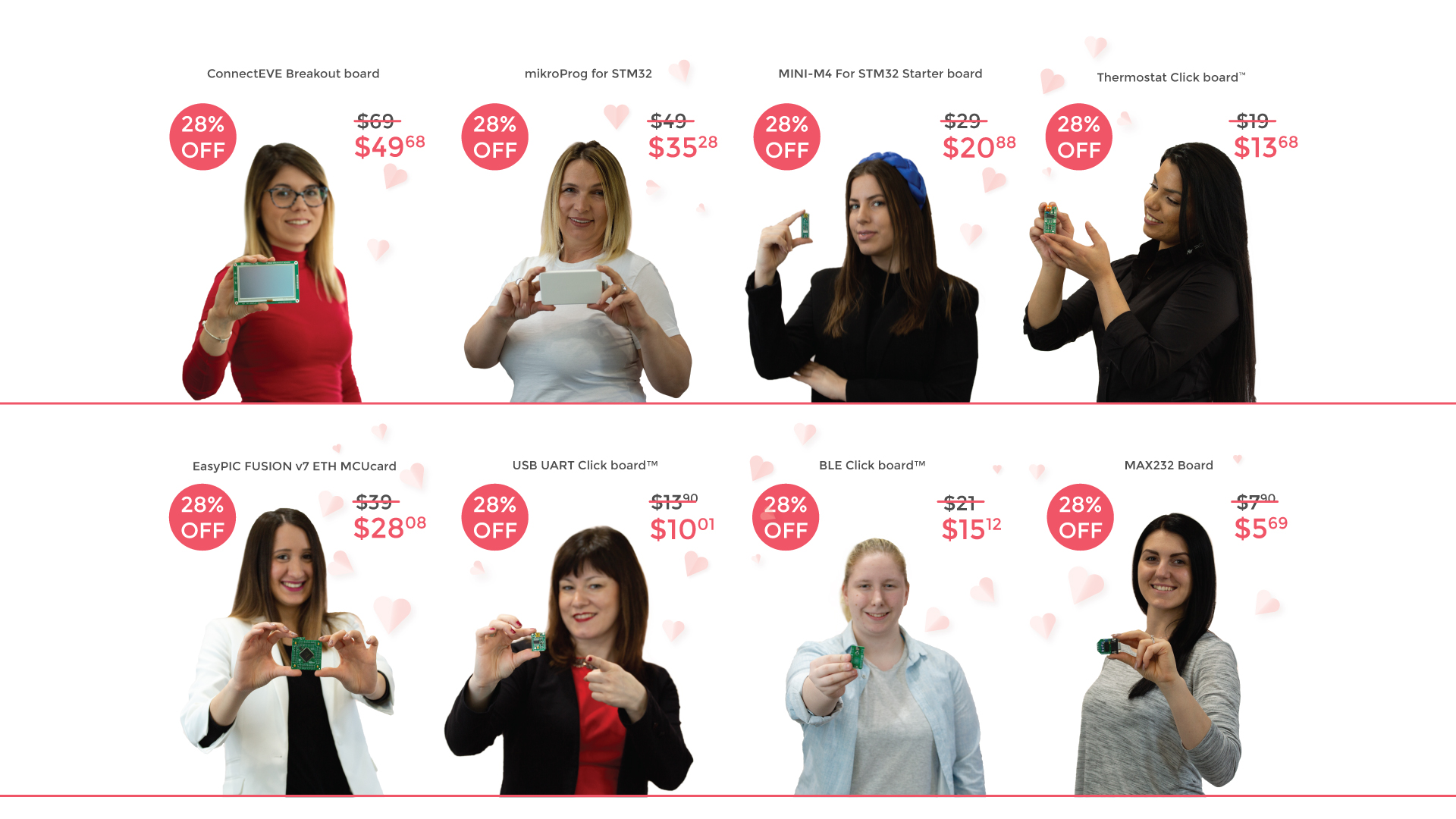 Starting now you can buy 8 selected products with a huge 28% discount thanks to the generocity of Mikroe‘s thoughtful women.