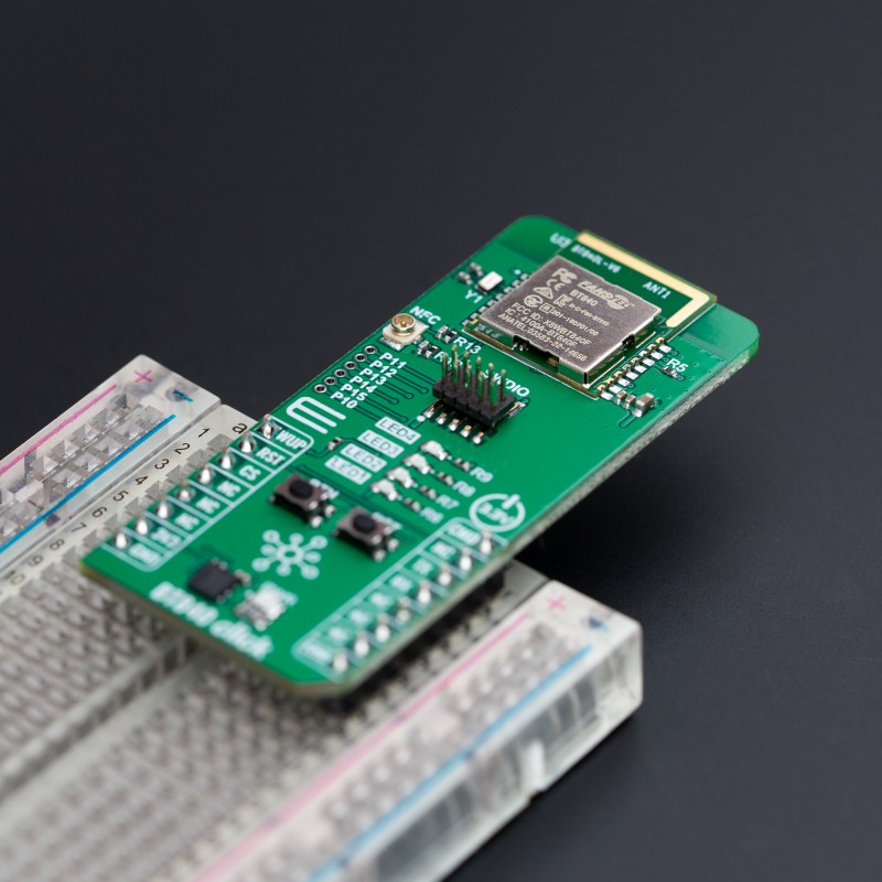 The BT840 module is a complete RF solution featuring an embedded 2.4GHz multi-protocol transceiver and support for NFC functionality, making it suitable for a broad range of IoT use cases. Its integrated PCB trace antenna ensures reliable communication with a maximum TX power of +4.9dBm, enabling long-range performance. Depending on the data rate, it can achieve communication ranges of up to 150 meters at 1Mbps and 210 meters at 125kbps, offering exceptional flexibility for diverse applications. The BT840 Click is ideal for IoT devices requiring efficient and secure wireless communication and is designed to support ultra-low power consumption, long-range connectivity, and high throughput. Its advanced features, including the Cryptographic Accelerator, ensure secure and reliable data transmission, meeting the critical needs of industrial, commercial, and consumer IoT applications.