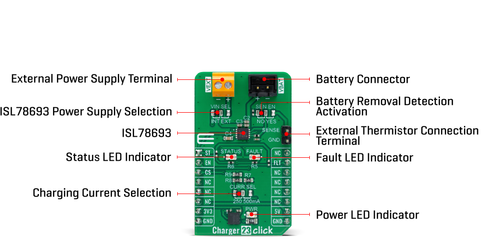 Charger 23 Click is a compact add-on board providing a single-cell battery charging solution. This board features the ISL78693, a single-cell Li-ion or Li-polymer battery charger from Renesas. The ISL78693 can operate with an input voltage as low as 2.6V and works as a linear charger with the battery charged in a Constant Current/Constant Voltage (CC/CV) profile. The charge current is selectable with an external resistor between 250 and 500mA. Additional features include the preconditioning of an over-discharged battery, an NTC thermistor interface for charging the battery in a safe temperature range, automatic recharge, and more. This Click board™ is suitable as a Li-Ion/Polymer battery charger for portable devices and accessories, power tools, and more.