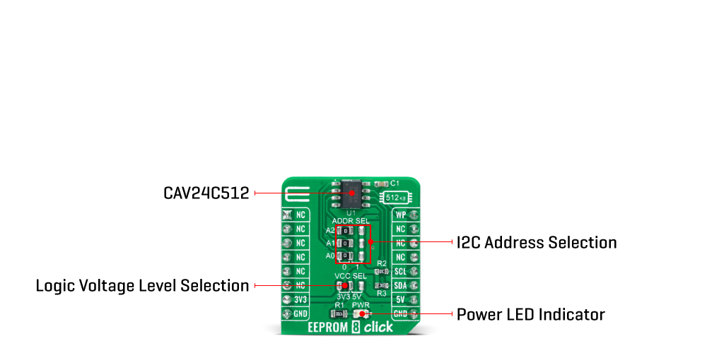 EEPROM 8 Click as its foundation uses the CAV24C512, a 512-Kb EEPROM with an I2C interface and Write Protection Mode from onsemi. The CAV24C512 is organized as 65,536 words of 8 bits each and benefits from a wide power supply range and 100 years of data retention combining their unprecedented data storage with excellent energy efficiency. It is highly reliable, lasting one million full-memory read/write/erase cycles. On-chip Error Correction Code (ECC) makes this Click board™ suitable for high-reliability applications where dependable nonvolatile memory storage is essential.