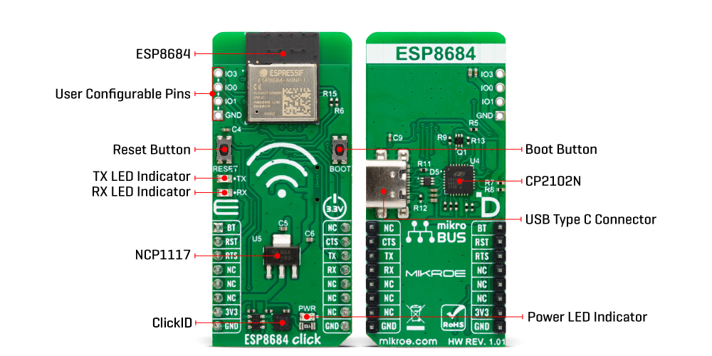 ESP8684 Click uses a standard 2-Wire UART interface to communicate with the host MCU with commonly used UART RTS and CTS control flow pins. Besides the available software and libraries we provide, you can use a set of AT commands to program the ESP8684 module. In addition to the UART bridge and two onboard buttons, you can enter the ESP8684’s boot mode via RST and BT pins of the mikroBUS™ socket. Thanks to the onboard NCP1117 LDO, which converts USB voltage into the 3.3V necessary for operation, this board can be standalone independent of the mikroBUS™ socket.