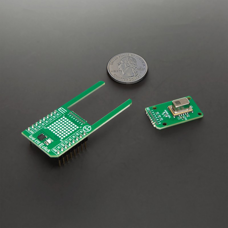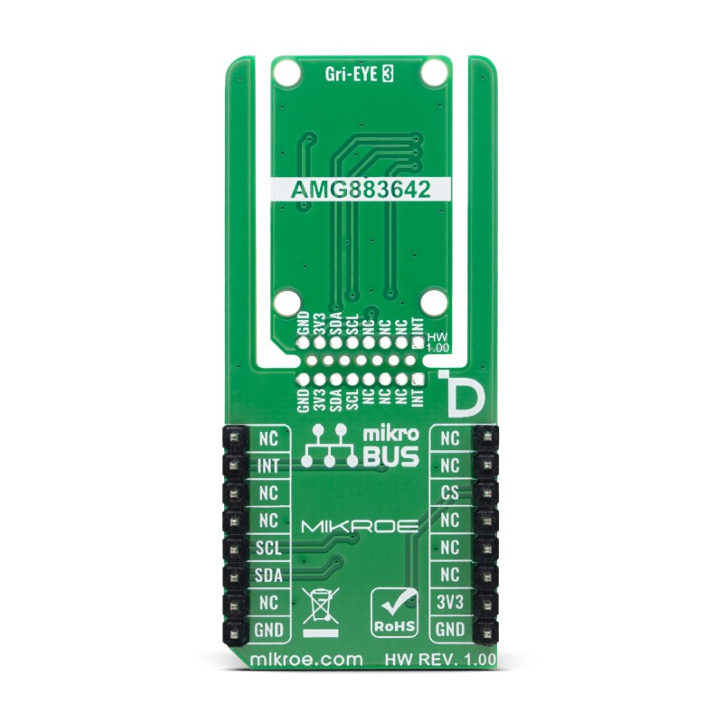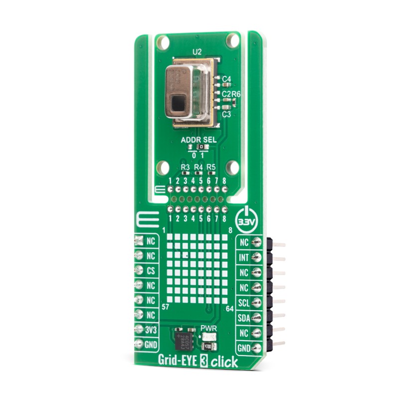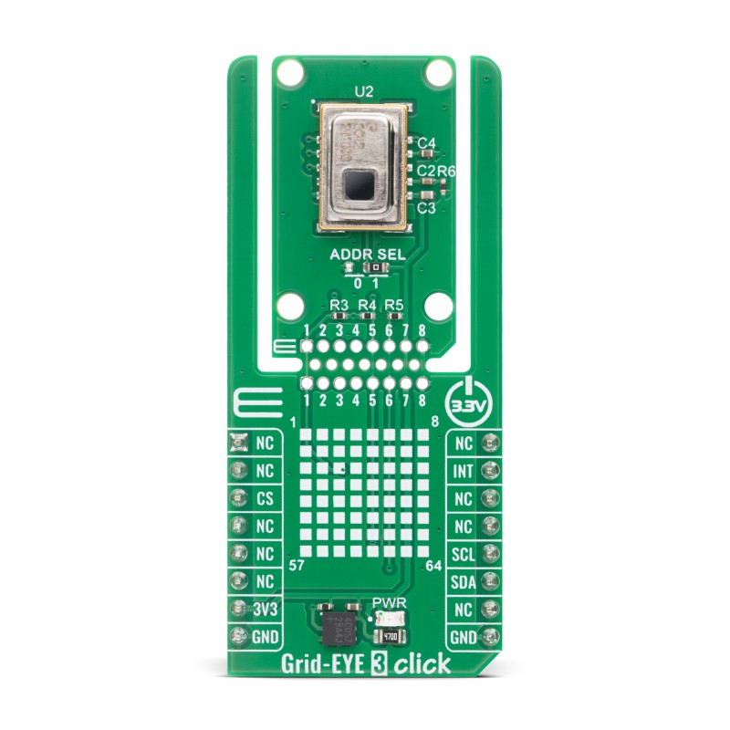 Grid-EYE 3 Click is based on the AMG883642, a narrow-type infrared array sensor from Panasonic built using advanced MEMS technology that provides precise thermal imaging capability by detecting temperature distribution over a two-dimensional area. This sensor is called Grid-EYE because it divides its field of view into a grid of 64 pixels (8×8), functioning as a low-resolution thermal camera capable of capturing temperature patterns rather than single-point measurements. Each of the 64 pixels continuously detects the surface temperature of its corresponding area, enabling reliable recognition of heat sources, moving objects, and environmental temperature changes. With a typical field of view of 35.6° both horizontally and vertically, the sensor covers a wide area suitable for room-scale monitoring.