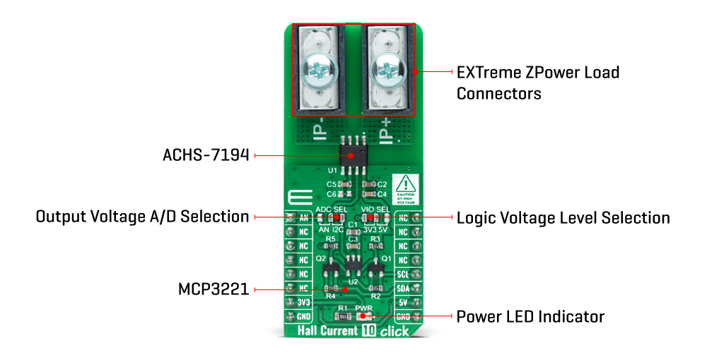 Hall Current 10 Click as its foundation uses the ACHS-7194, a Hall-effect current sensor that sends an analog voltage proportional to the magnetic field intensity caused by the current flowing through the primary input conductor from Broadcom Limited. Without a magnetic field, the output voltage is half of the supply voltage. The ACHS-7194 can detect both DC and AC designed for the current range of ±40A. Device accuracy is optimized across the operating ambient temperature through the close proximity of the magnetic signal to the Hall sensors.