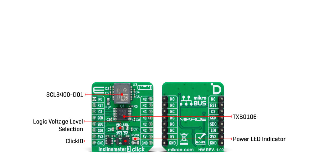 Inclinometer 3 Click is fully compatible with the mikroBUS™ socket and can be used on any host system supporting the mikroBUS™ standard. It comes with the mikroSDK open-source libraries, offering unparalleled flexibility for evaluation and customization. What sets this Click board™ apart is the groundbreaking ClickID feature, enabling your host system to seamlessly and automatically detect and identify this add-on board.