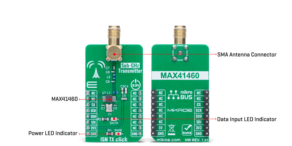 ISM TX Click is based on the MAX41460, a UHF sub-GHz ISM/SRD transmitter designed to transmit On-Off Keying (OOK), Amplitude- Shift Keying (ASK), Frequency-Shift Keying (FSK), and Gaussian (G)FSK (or 2GFSK) data from Analog Devices. The crystal-based architecture of the MAX41460 provides greater modulation depth, faster frequency settling, higher tolerance of the transmit frequency, and reduced temperature dependence. It integrates a fractional phase-locked loop (PLL); so a single, low-cost crystal of 16MHz used on this Click board™ can generate commonly used world-wide sub-GHz frequencies. A buffered clock-out signal makes the device compatible with almost any MCU or code-hopping generator. The MAX41460 feature fast oscillator Wake-Up upon data activity detection and has an Auto-Shutdown feature to extend battery life.