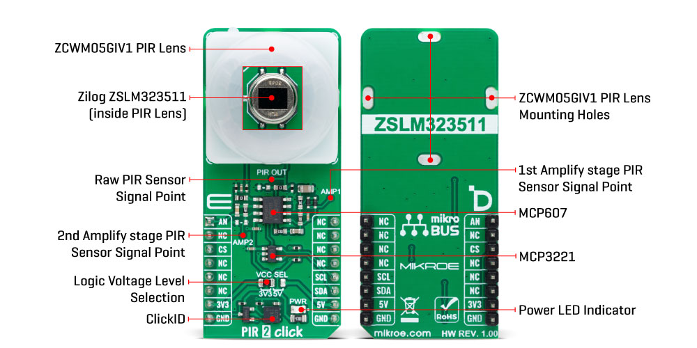 PIR 2 Click is fully compatible with the mikroBUS™ socket and can be used on any host system supporting the mikroBUS™ standard. It comes with the mikroSDK open-source libraries, offering unparalleled flexibility for evaluation and customization. What sets this Click board™ apart is the groundbreaking ClickID feature, enabling your host system to seamlessly and automatically detect and identify this add-on board.