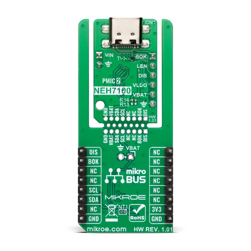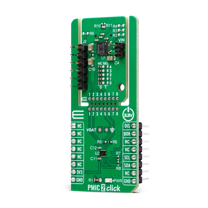PMIC 2 Click can be configured either through hard-coding jumpers (HC SEL) or via an I2C interface operating at 100kHz, providing flexibility in setup and integration. In addition to the standard I2C communication pins, the board also features dedicated control and status signals from the NEH7100, such as the DIS pin, which places the device into a low-power consumption mode, and the BOK pin, which serves as an indicator that the battery voltage is above the configured low-voltage detection (LVD) threshold. For extended accessibility to the PMIC’s capabilities, PMIC 2 Click incorporates an additional header (J2) that exposes multiple useful signals, including BOK, DIS, LEN for enabling the LDO regulator, VLDO as the regulated LDO output, and VBAT, which outputs the harvested energy and serves as the power supply input for the PMIC.