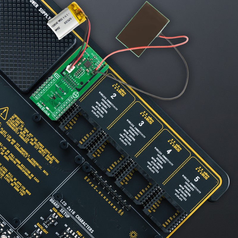 PMIC 2 Click is based on the NEH7100, an inductorless power management IC from Nexperia designed for energy harvesting in low-power applications. Optimized for harvesting energy from a wide range of light sources, including indoor and outdoor photovoltaic cells connected to VIN pins, the device can also use other sources such as kinetic movement, vibrations, thermal variations, and electromagnetic fields with the aid of external auxiliary components. The NEH7100 collects energy from a suitable harvester to charge a storage element (connected on VBAT), such as a rechargeable battery or a supercapacitor, while Nexperia’s advanced maximum power point tracking (MPPT) technology, employing an embedded hill-climbing algorithm, ensures maximum power delivery to the storage element.