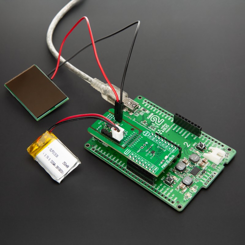 NOTE: The PMIC 2 Click package includes a PV cell (Glass Indoor Solar Cell Module) and a pair of wire jumpers (Female to Female, 15cm, black and red) to support testing of energy-harvesting features. More information about the included PV cell module is available at its product page.