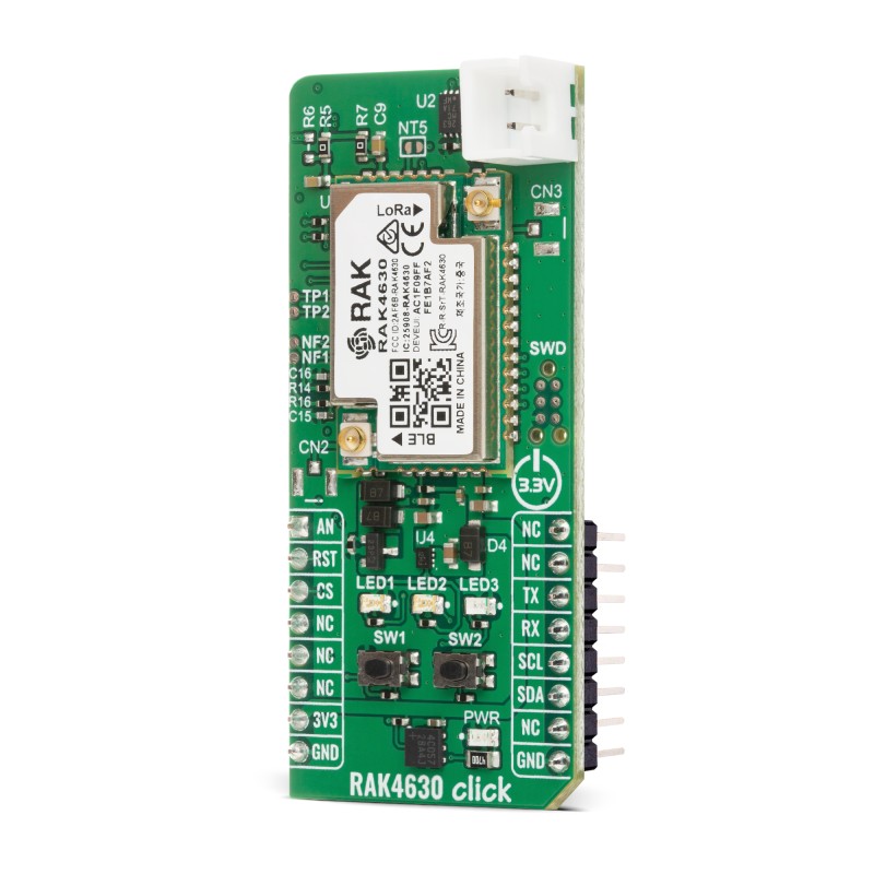 Along with the communication and control pins, this Click board™ also includes a reset pin (RST) enabling easy module resetting, AN pin connected to the analog input pin of the RAK4630 module, and SWD pads designed for use with MIKROE's 6-pin Needle Cable, providing an optional flash and debug SWD (Serial Wire Debug) interface functionality. Additionally, the board features two user-configurable buttons (SW1 and SW2) and two user-configurable LED indicators (a red LED1 and yellow LED2) for customizable user interaction and status indication.