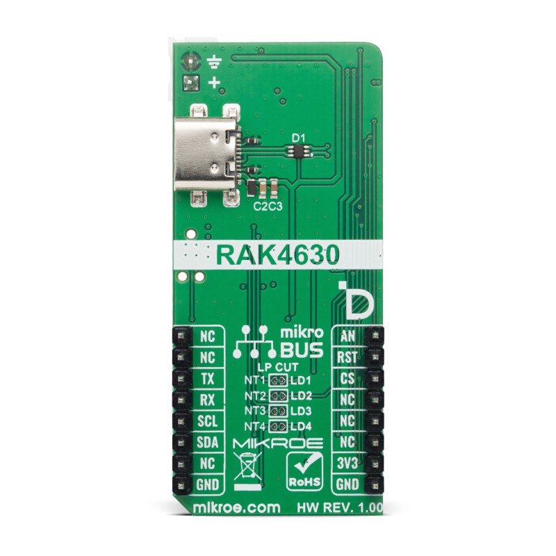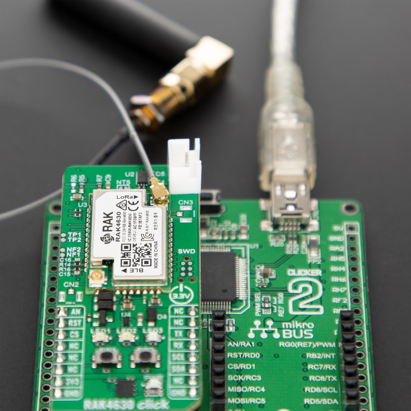 RAK4630 Click demo application is developed using the NECTO Studio, ensuring compatibility with mikroSDK's open-source libraries and tools. Designed for plug-and-play implementation and testing, the demo is fully compatible with all development, starter, and mikromedia boards featuring a mikroBUS™ socket.