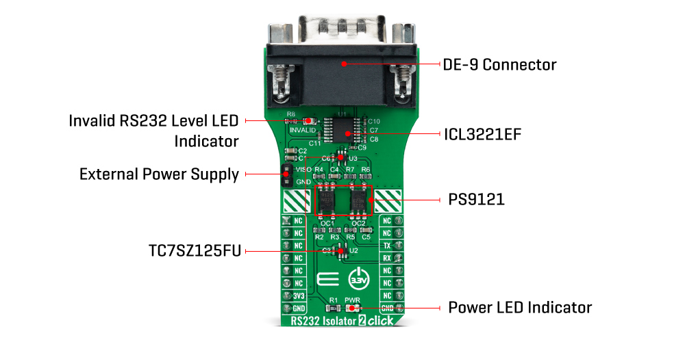 This Click board™ represents an isolated RS232 interface configuration using PS9121, an optically coupled high-speed active low type isolator from Renesas, containing a GaAlAs LED on the input side, a photodiode, and a signal processing circuit on the output side rated for 3.75kV isolation and up to 15Mbps data rate. The RS232 transceiver ICL3221 is specified with a data rate of 250kbps and operates from a 3.0V to 3.6V external power supply header on the board's right side. In addition to the optocouplers, the TC7SZ125FU logic buffers from Toshiba Semiconductor are used to drive the necessary LED currents that usually cannot be provided by low-power MCUs or RS232 receiver outputs.