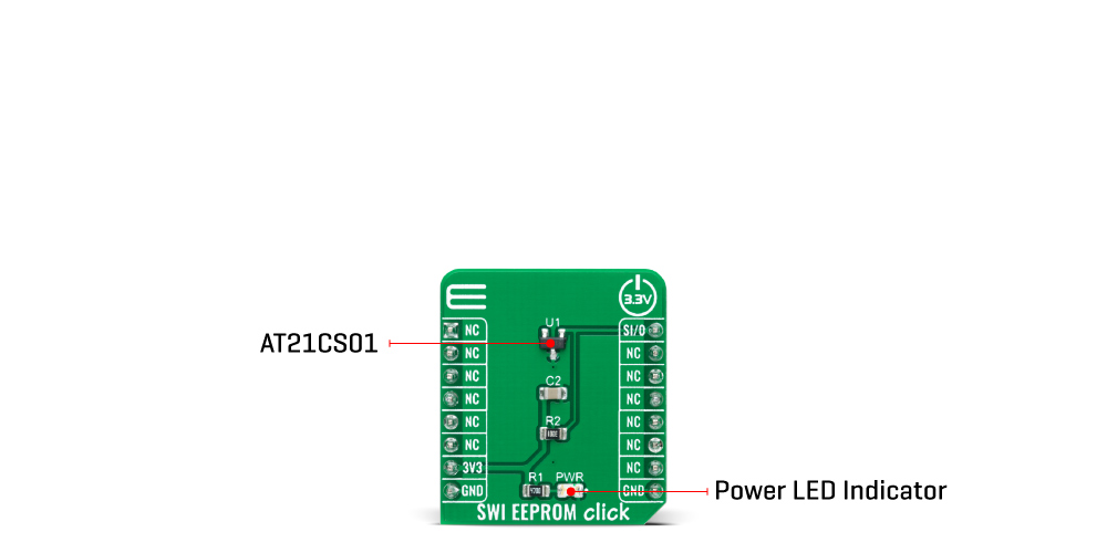 SWI EEPROM Click, as its foundation, uses the AT21CS01, 2-pin serial electrically erasable and programmable read-only memory (EEPROM) that harvests energy from the SI/O pin to power the integrated circuit from Microchip Technology. It provides 1,024 bits organized as 128 words of 8 bits each, a security register with a 64-bit factory programmed serial number, and an extra 16-bytes of user-programmable and permanently lockable storage. It delivers a guaranteed unique serial number for inventory tracking, asset tagging and can always protect the data if needed.