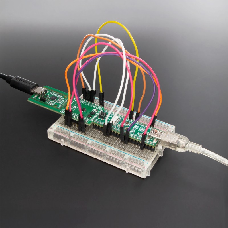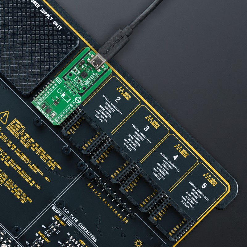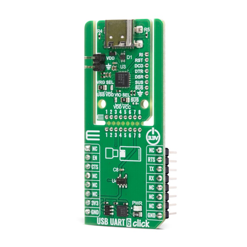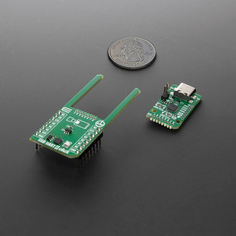 USB-to-UART bridge functionality, USB 2.0 full-speed controller, high data transfer rates, support for standard CDC drivers eliminating custom driver requirements, integrated 512-byte transmit and receive buffers, hardware flow control pins, yellow SUS LED indicating suspend mode, Click Snap format, and more |